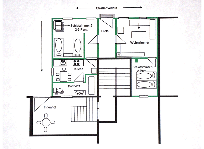 Von dort gelangen Sie in das Zweibettzimmer mit zusätzlicher Schlafcouch (Futon) sowie in die Küche und das Badezimmer mit Tageslicht.