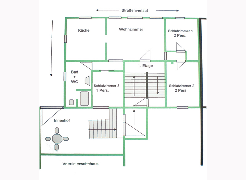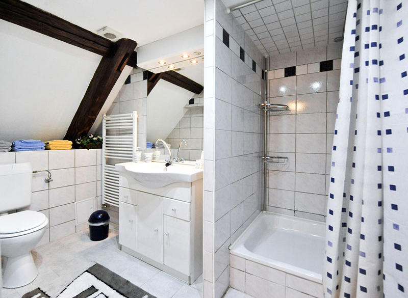 Von dort gelangen Sie in das Einzelzimmer sowie in das großzügeige Duschbad/WC dieser gemütlichen Ferienwohnung.