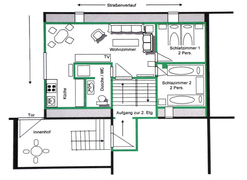 befindet sich im Erdgeschoß unseres Apartmenthauses.Diese Wohnung wurde durch den DTV (Deutscher-Tourismus-Verband) mit drei Sternen bei einer Belegung bis 4 Personen ausgezeichnet.