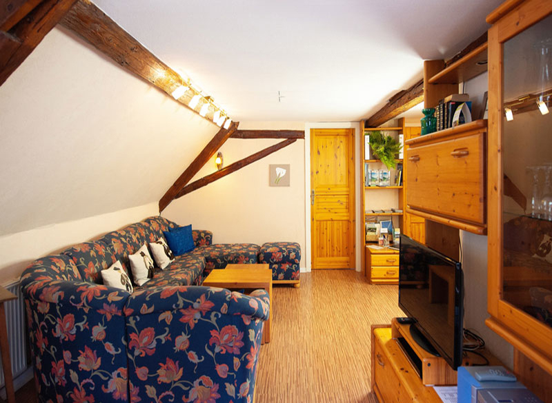 Das gemütliche Wohnzimmer mit großer Couch, TV mit Flachbildschirm sowie DVD- und Musikanlage ist der Zentrale Raum dieser Ferienwohnung mit Deckenschrägungen und Fachwerkbalken.